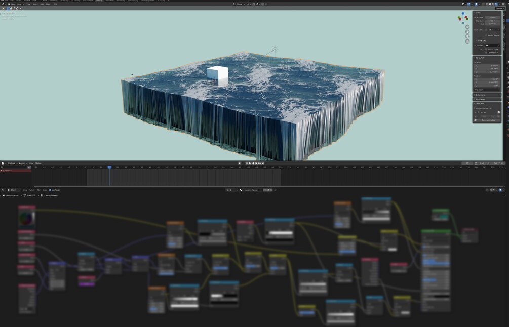 This material is meant for use with Blender's ocean modifier, and may behave unpredictably on other non-ocean meshes. The material features fake underwater caustic shadows, light absorption, as well as a nice watery finish on top. The material is fully procedural, and there are no images involved.